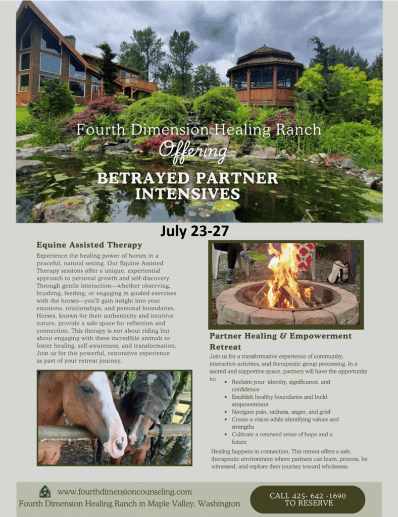 In addition to counseling, therapy and coaching for sex addiction, betrayed partners and betrayal trauma, we offer unique workshops & Intensive Retreats at Fourth Dimension Healing Ranch in Maple Valley, WA.