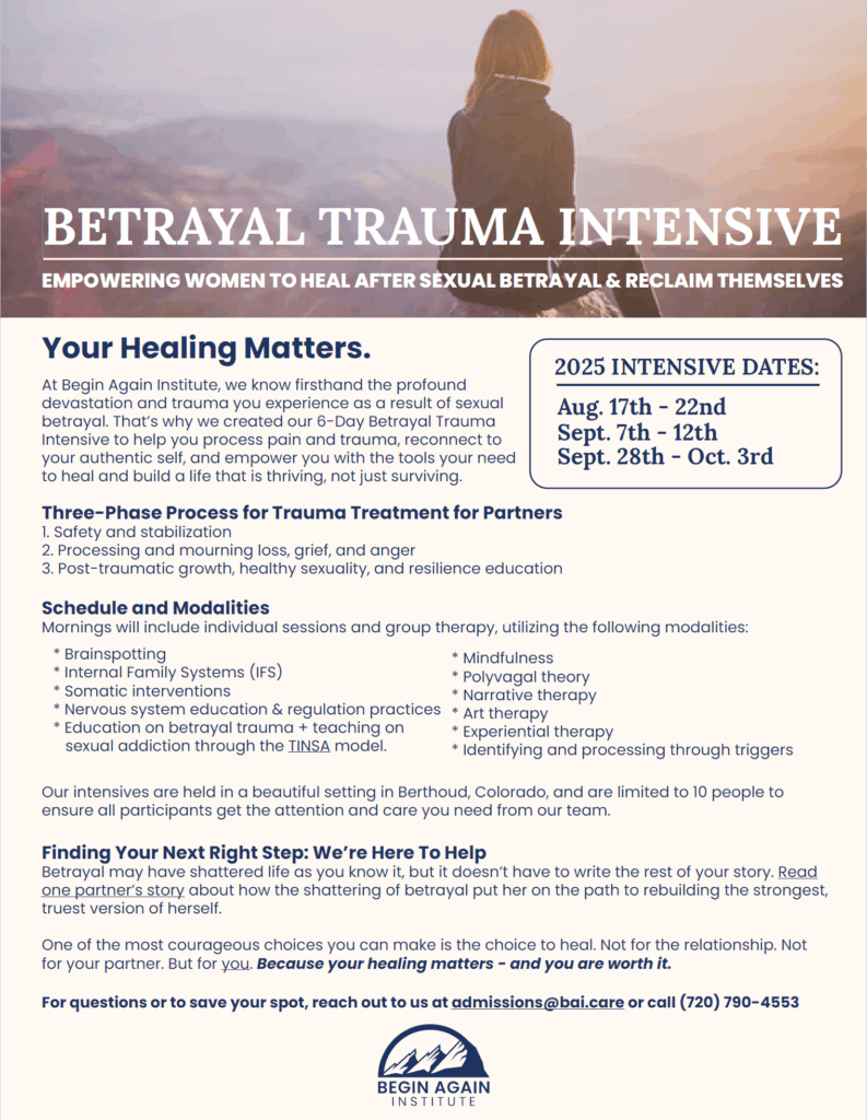 There is a solution to sexual acting out and the trauma that comes from sexual betrayal. There is a treatment protocol for sex and porn addiction to help the person who has been sexually acting out, as well as a treatment protocol to help the betrayed partner heal the betrayal trauma wounds that occur due to the infidelity from this devastating addiction. There is also a treatment protocol to help the couple survive, heal, and even grow to the point of vulnerability, truth, trust, and real emotional intimacy. Our highly educated and experienced sex addiction, porn addiction, betrayed partner, infidelity betrayal trauma, marriage and family therapists offer a process and hope for a better tomorrow in your life and relationships.